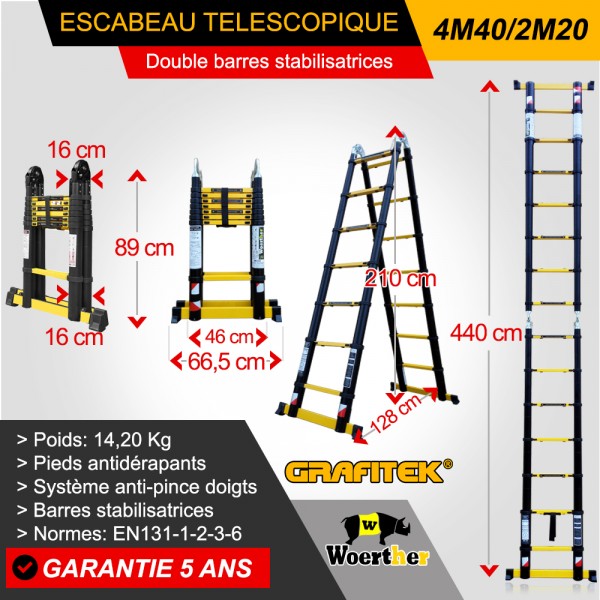 Avec la composition en ALUMINIUM 7175T6 & GRAPHITE ,la rigidité de votre échelle télescopique Woerther est encore améliorée !