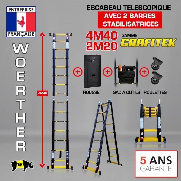 Découvrez la nouvelle ESCABEAU TELESCOPIQUE 4M40 - WOERTHER - GAMME PRO GRAFITEK pour vos travaux de bricolage, aussi bien pour les particuliers que les professionnels.